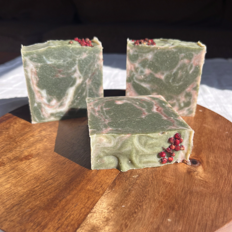 Ingredients: Olive Oil, Spring Water, Grass Fed Beef Tallow, Organic Coconut Oil, Sodium Hydroxide, Raw Shea Butter, Fragrance, Castor Oil, Spirulina, Bentonite Clay, Kaolin Clay, Madder Root