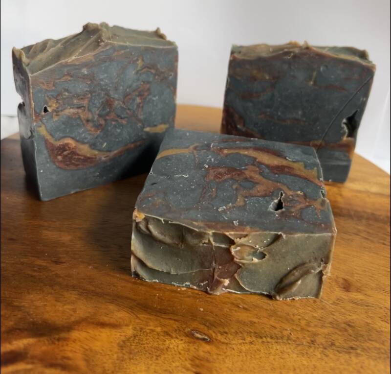 Ingredients: Olive Oil, Grass Fed Beef Tallow, Organic Coconut Oil, Spring Water, Sodium Hydroxide, Goat Milk, Raw Shea Butter, Fragrance, Castor Oil, Activated Charcoal, Madder Root, Turmeric